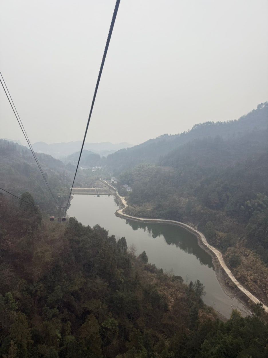 도시를 넘어서 산으로 가는 정말 긴 케이블 카입니다.
