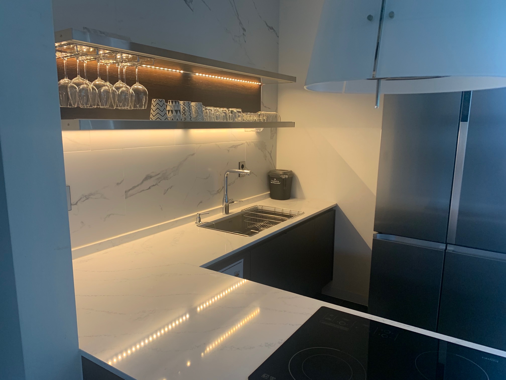 폴딩도어 안을 들어가면 시스템 에어컨에 미니 싱크와 냉장고가 있고