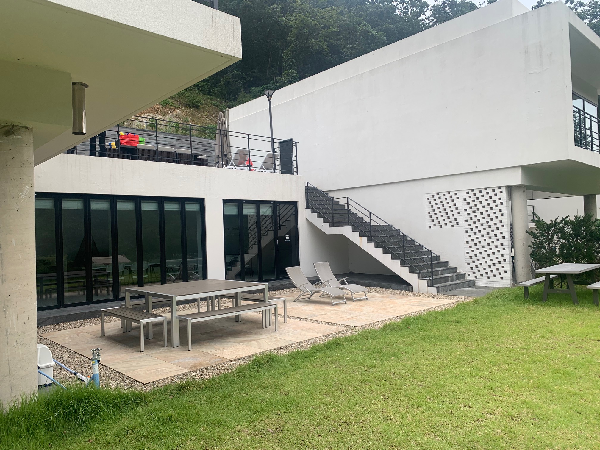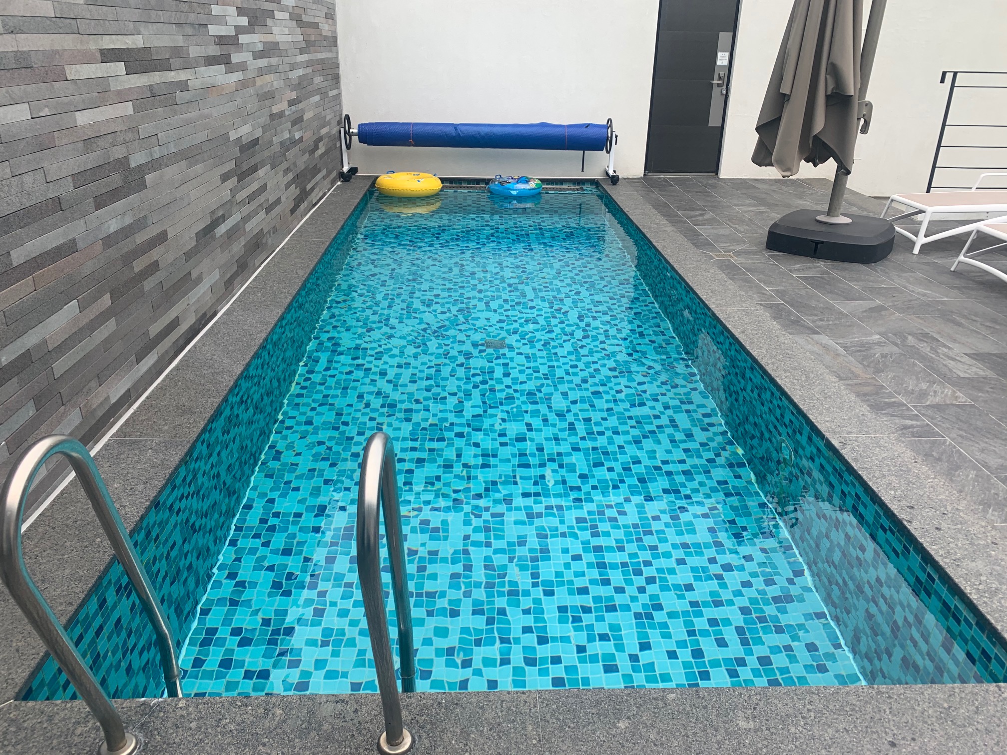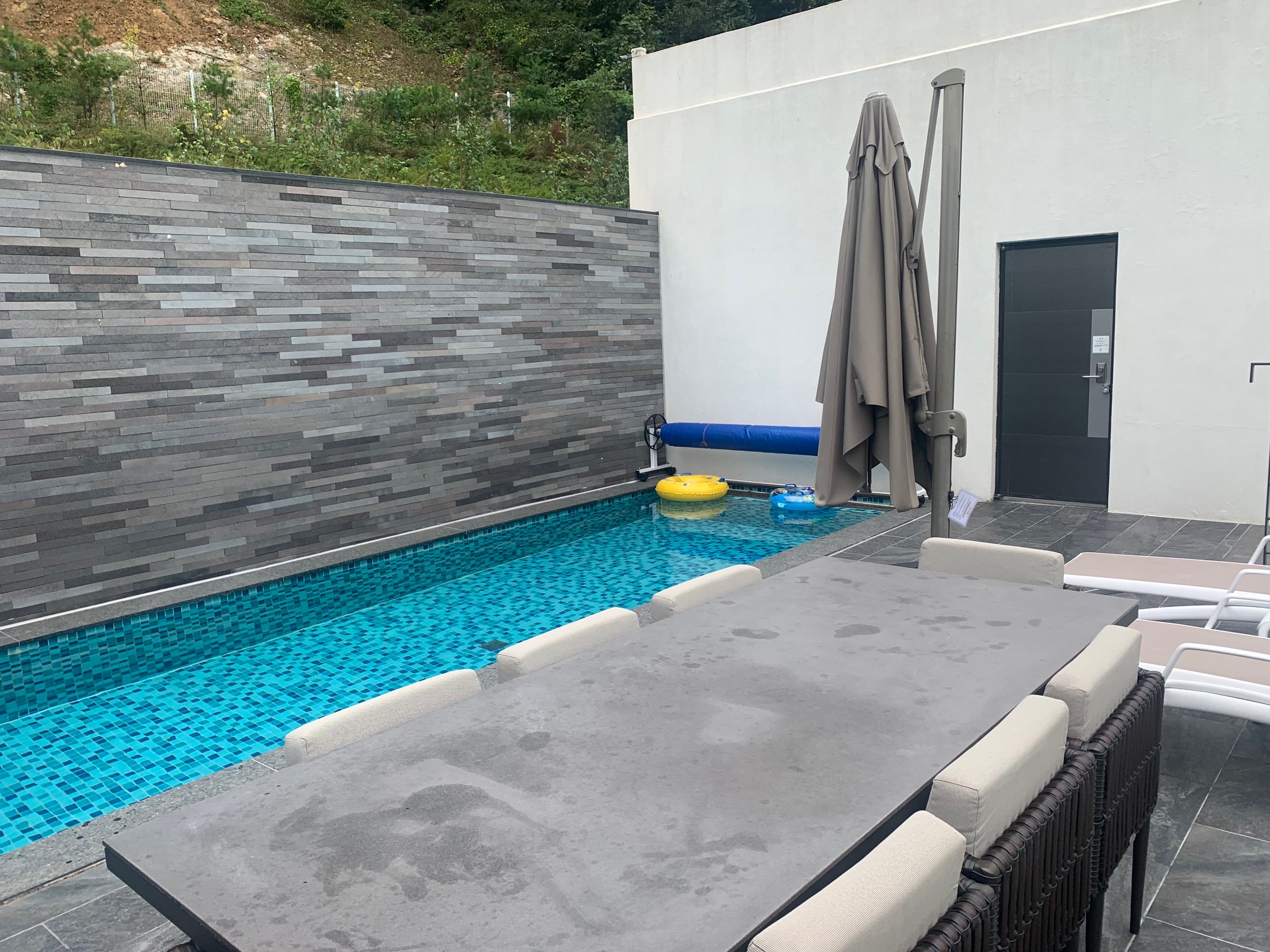 객실은 복층입니다. 야외 수영장이 있는 곳에 테이블이랑 의자가 있습니다.
