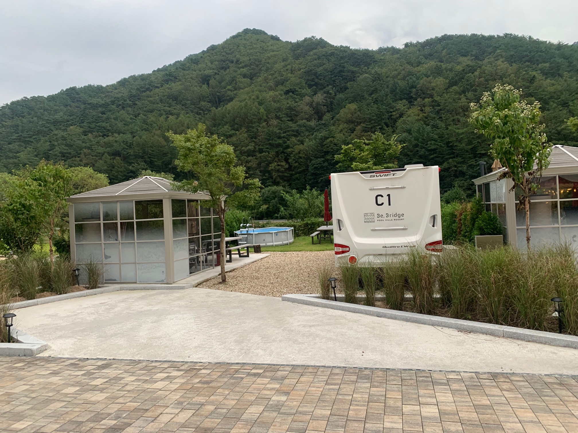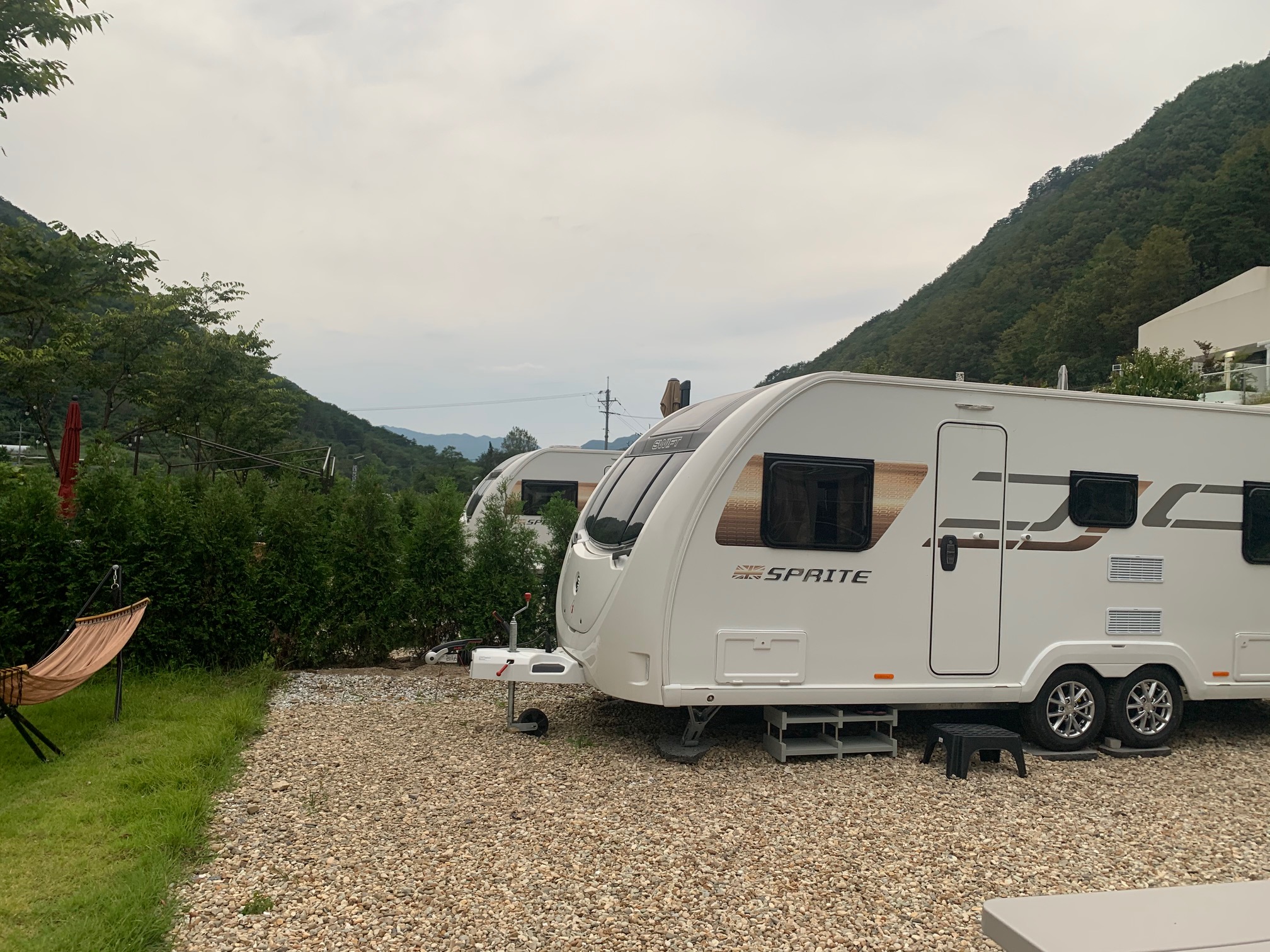 카라반이 있고요, 옆에 바베큐를 먹을 수 있는 유리로된 하우스가 있고