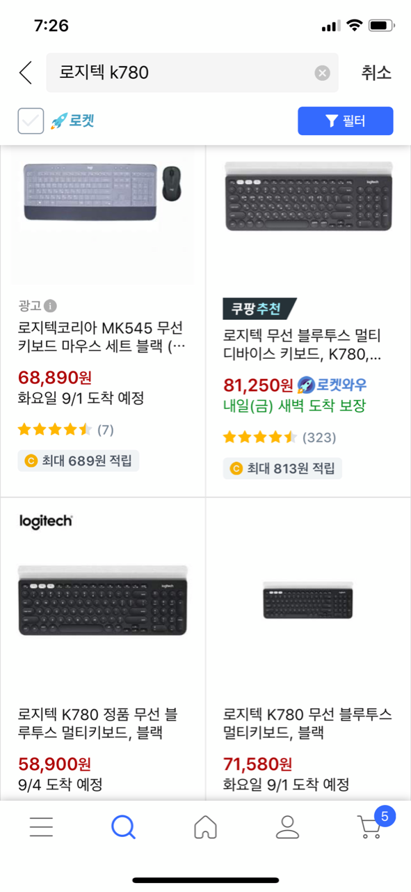 네이버 쇼핑과 쿠팡에 로지텍 K780 검색 결과입니다.