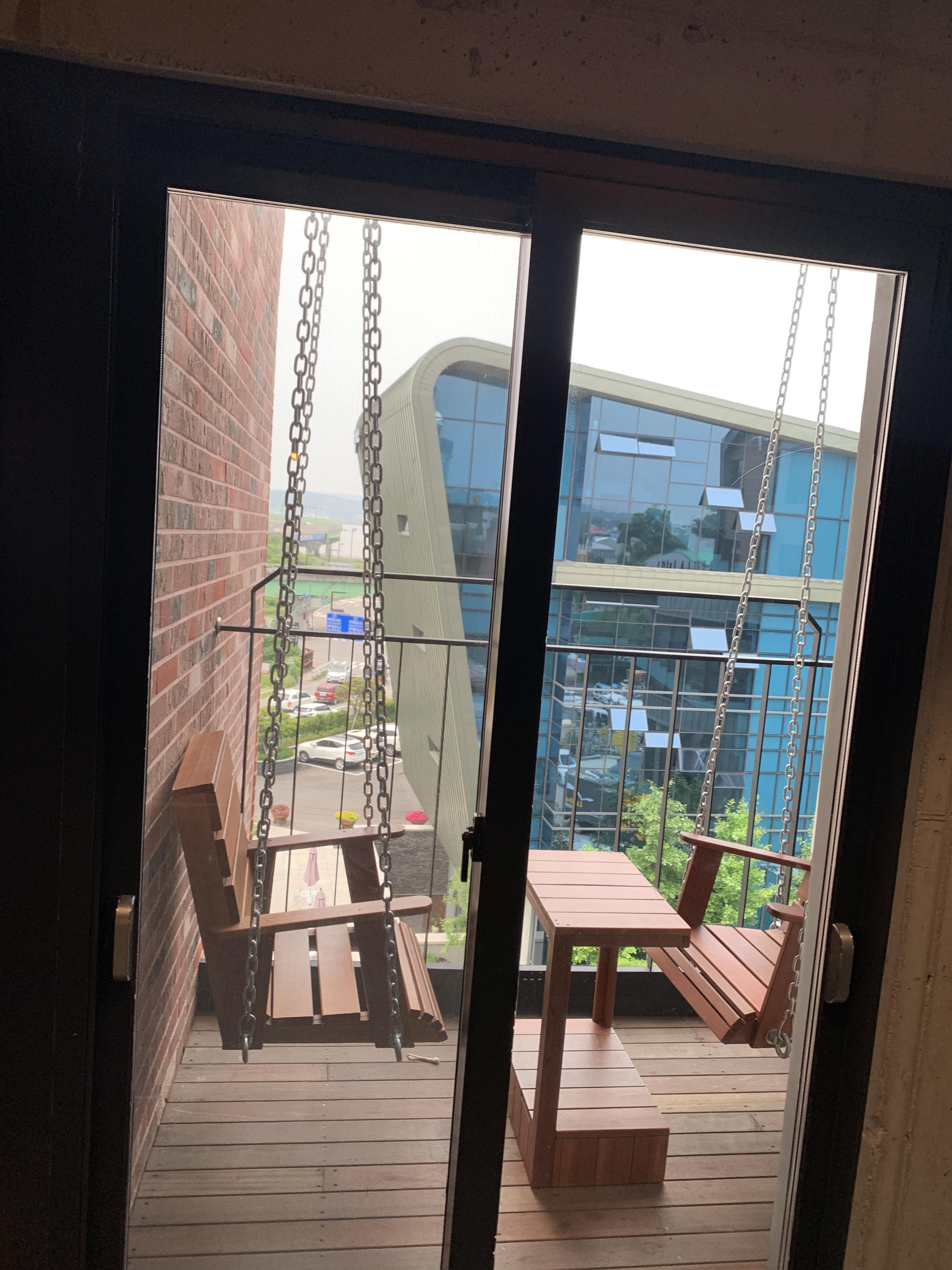 창문 밖으로 그네가 있습니다.